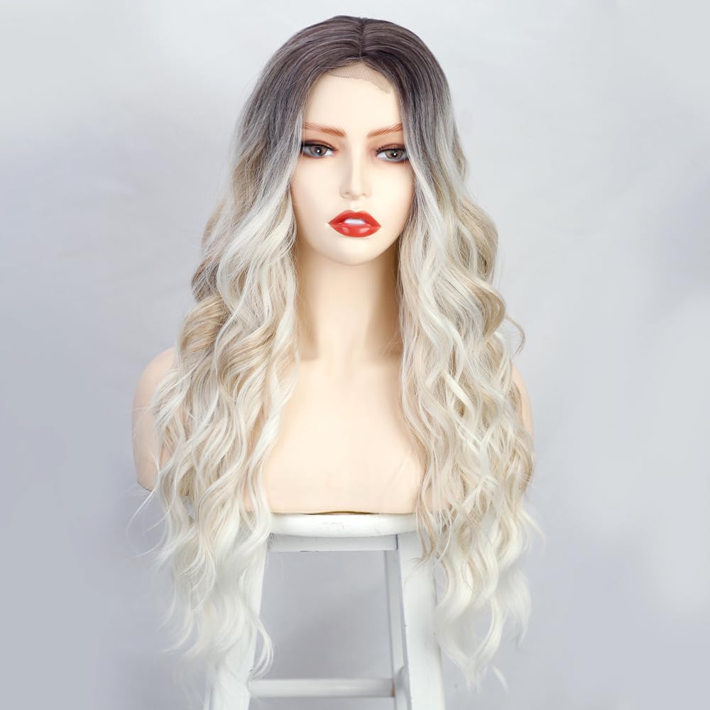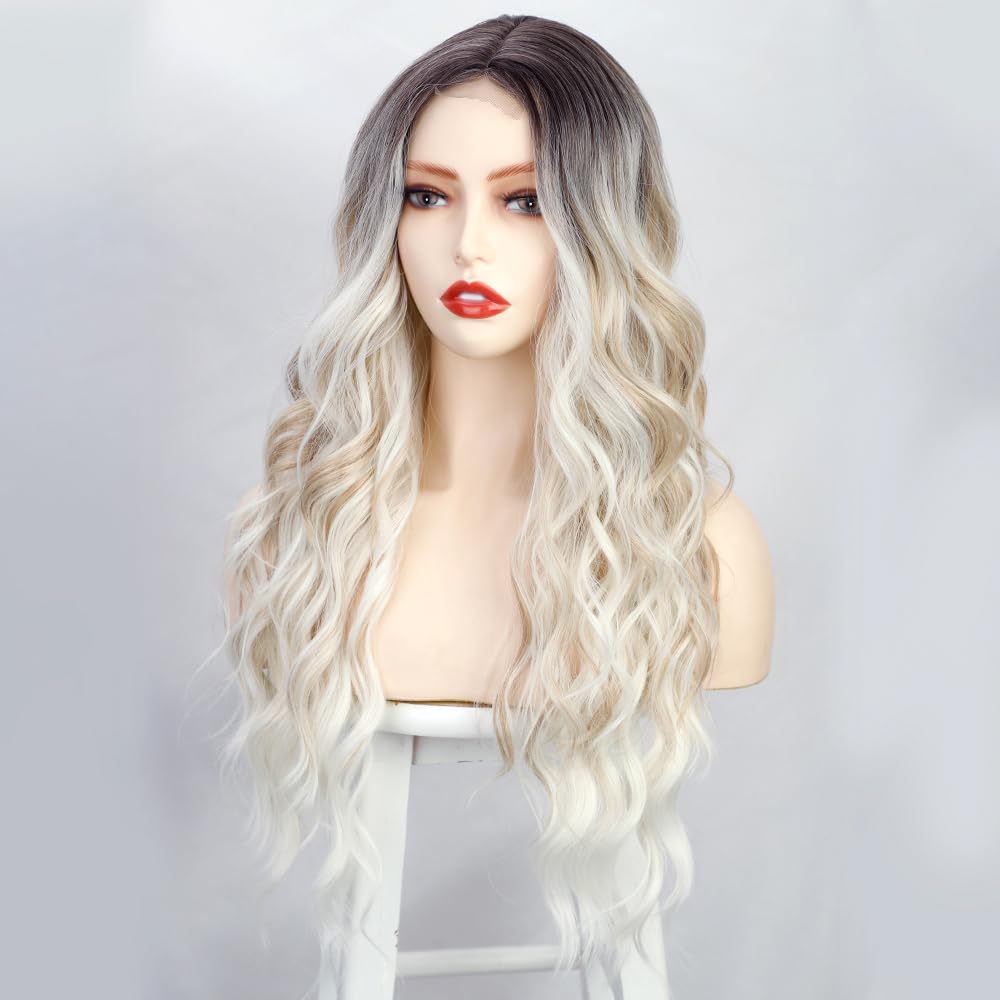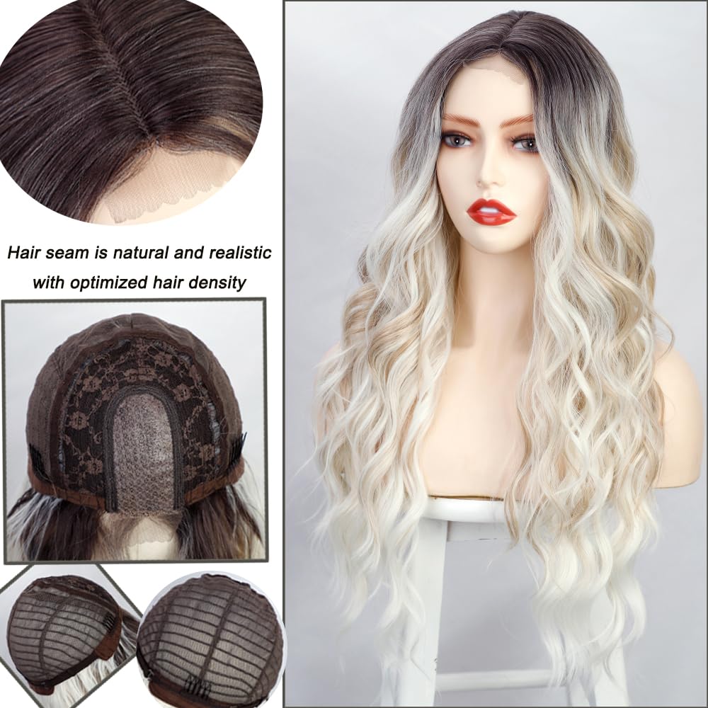KAMA U-Part Lace Front Long Wigs For Women Middle Part Wavy Curly Wig With Dark Roots Synthetic Heat Resistant Fiber Wig For Daily Party Use (Platinum Blonde)