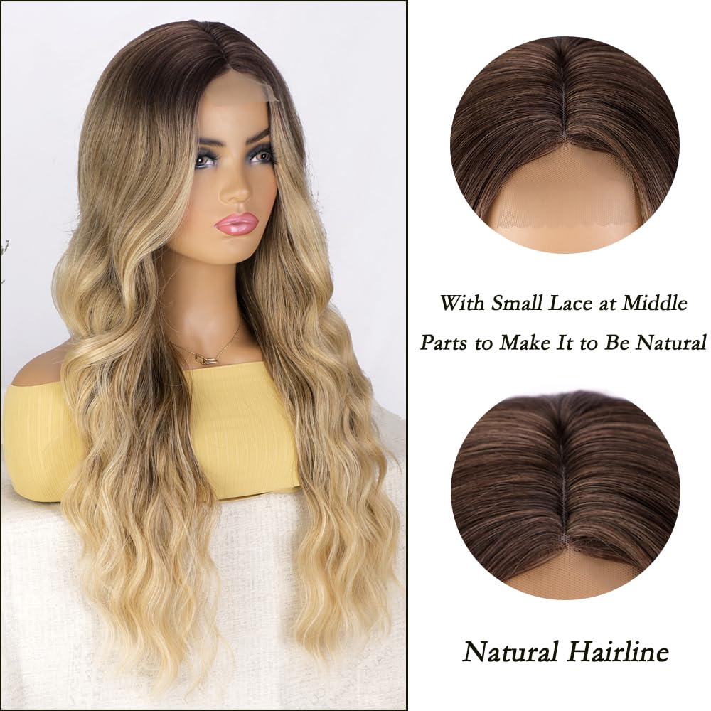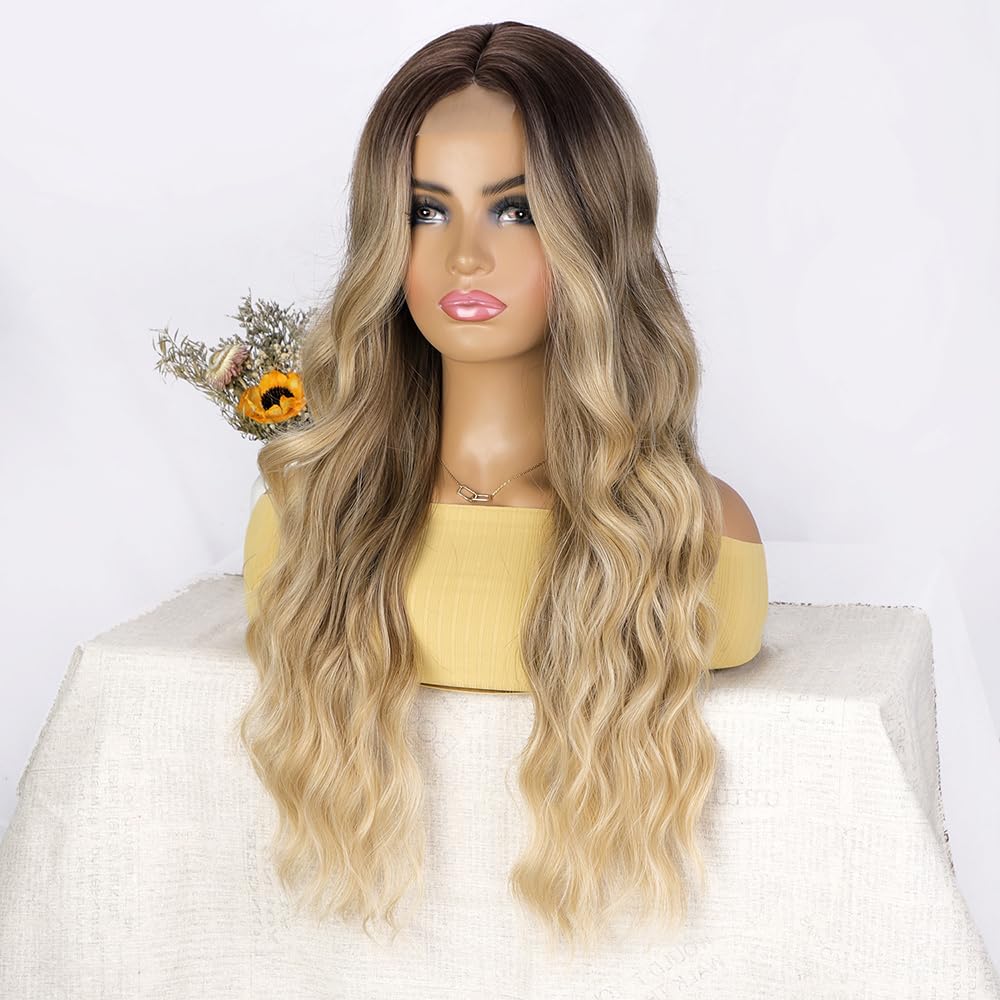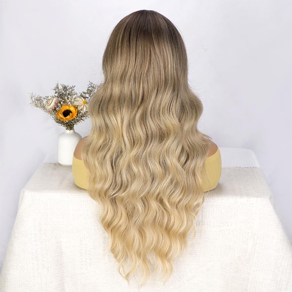 KAMA U-Part Lace Front Long Wigs For Women Middle Part Wavy Curly Wig With Dark Roots Synthetic Heat Resistant Fiber Wig For Daily Party Use (Blonde Ombre)
