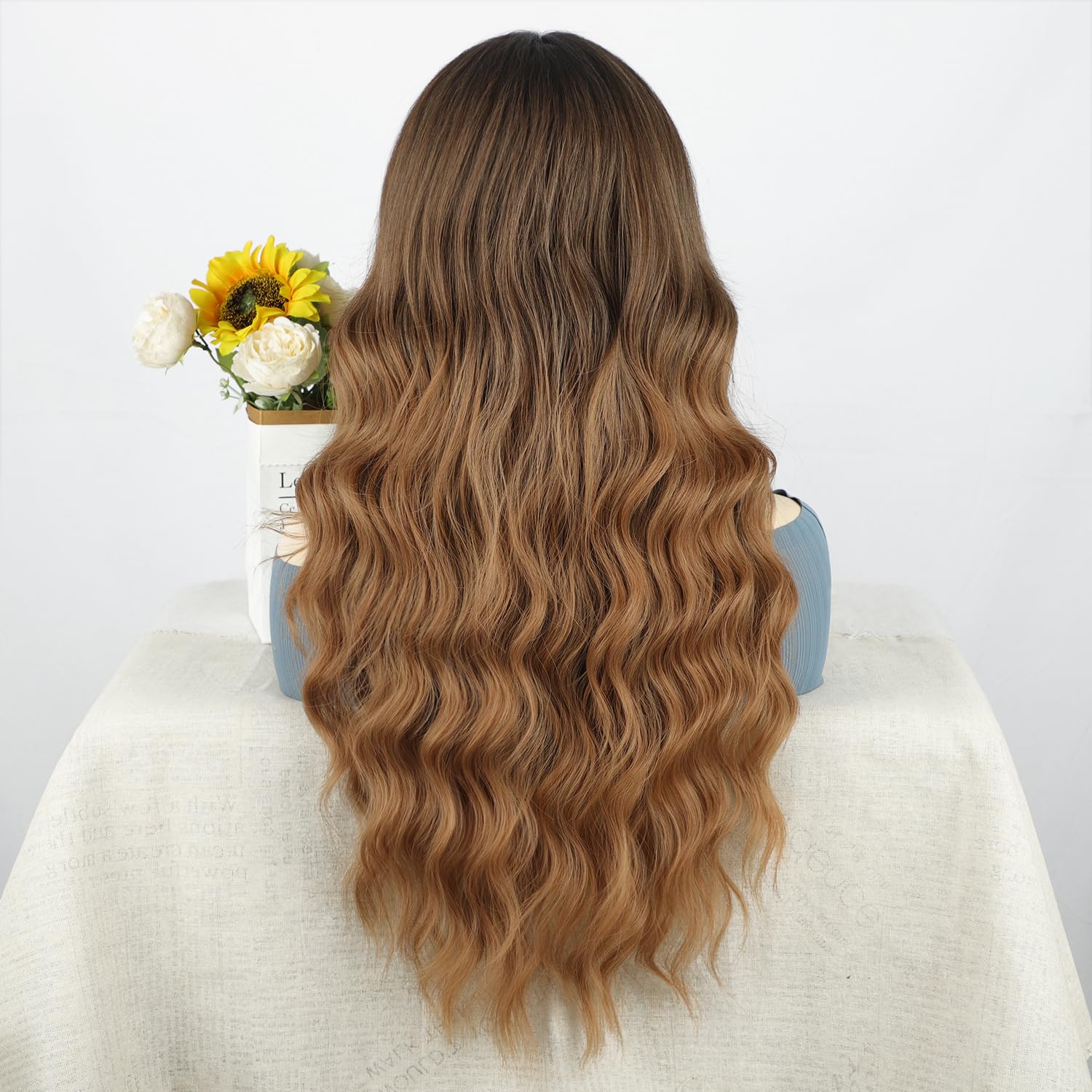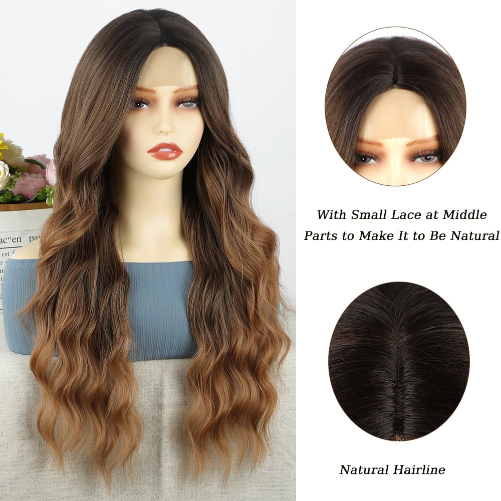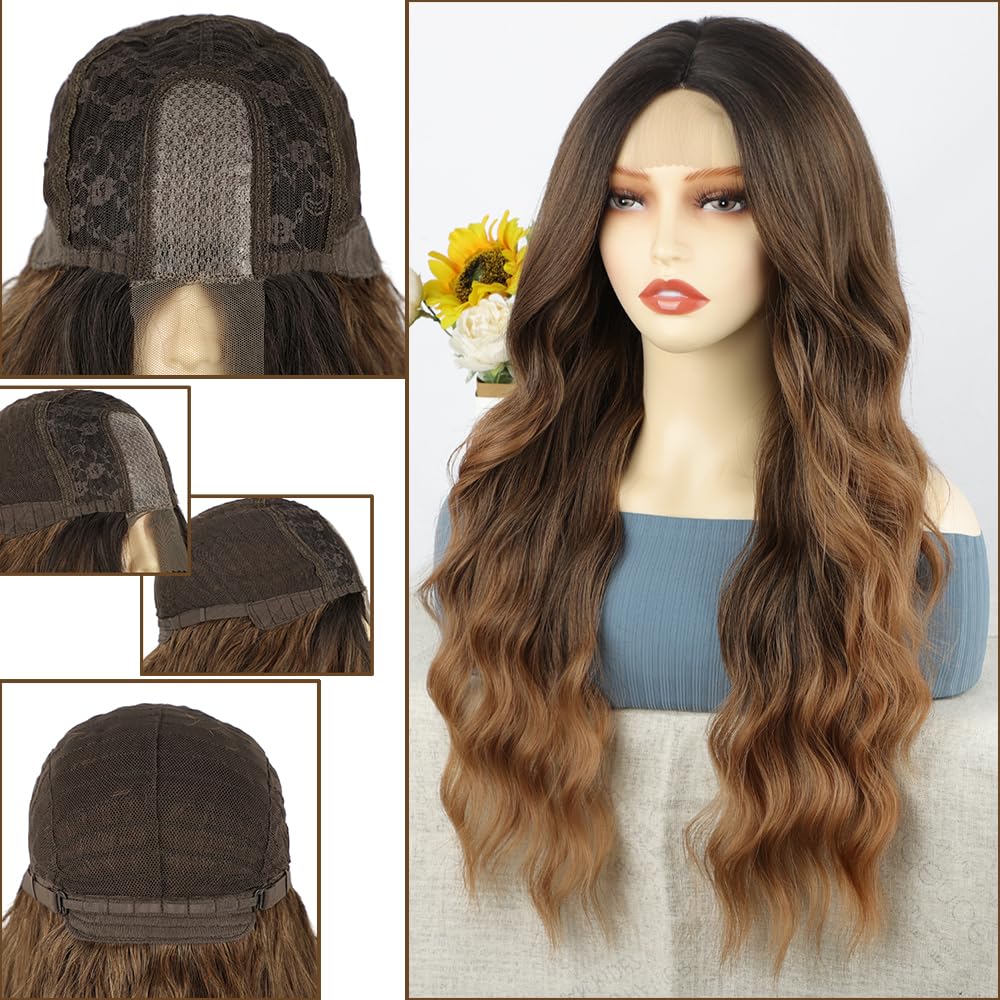 KAMA U-Part Lace Front Long Wigs For Women Middle Part Wavy Curly Wig With Dark Roots Synthetic Heat Resistant Fiber Wig For Daily Party Use (Brown Ombre)
