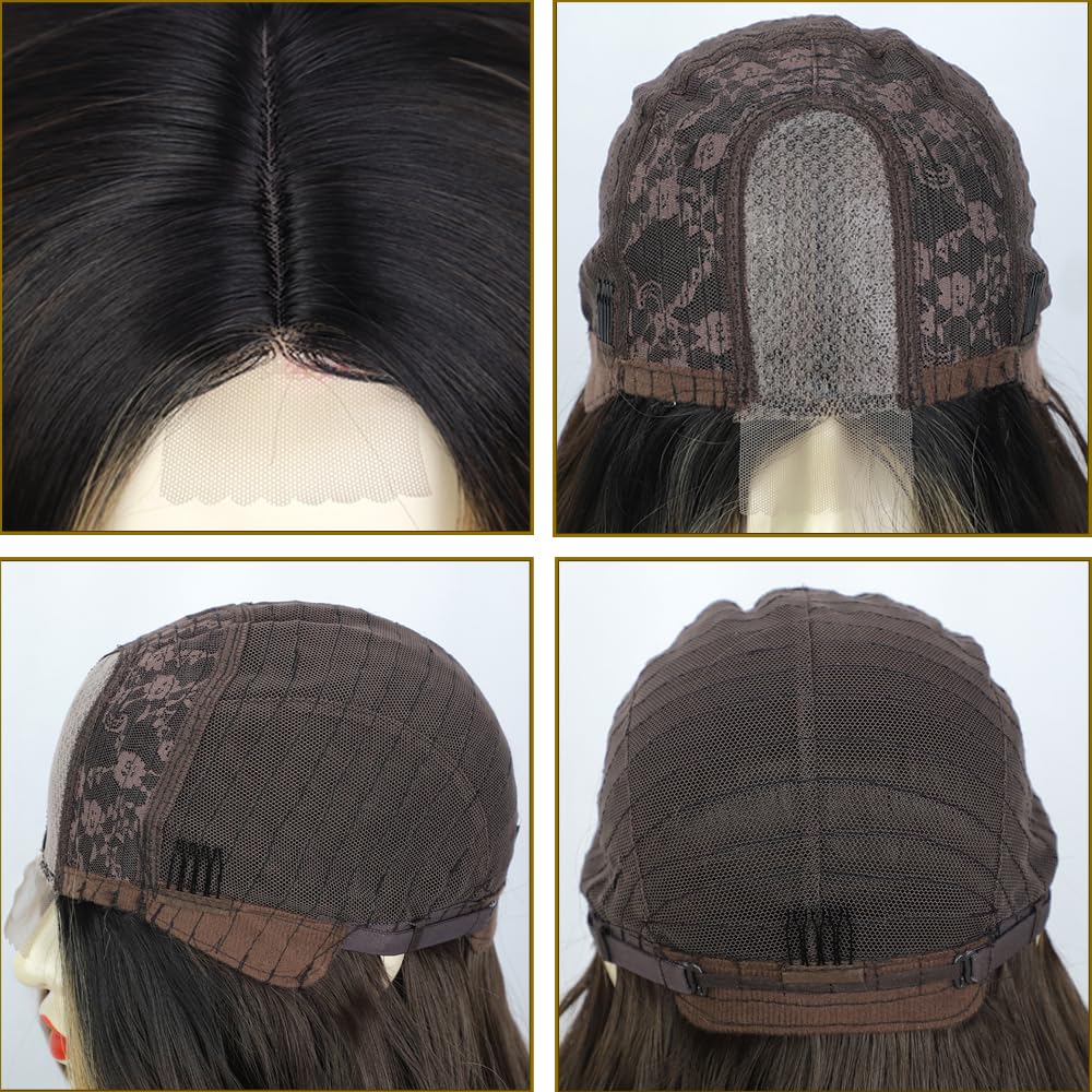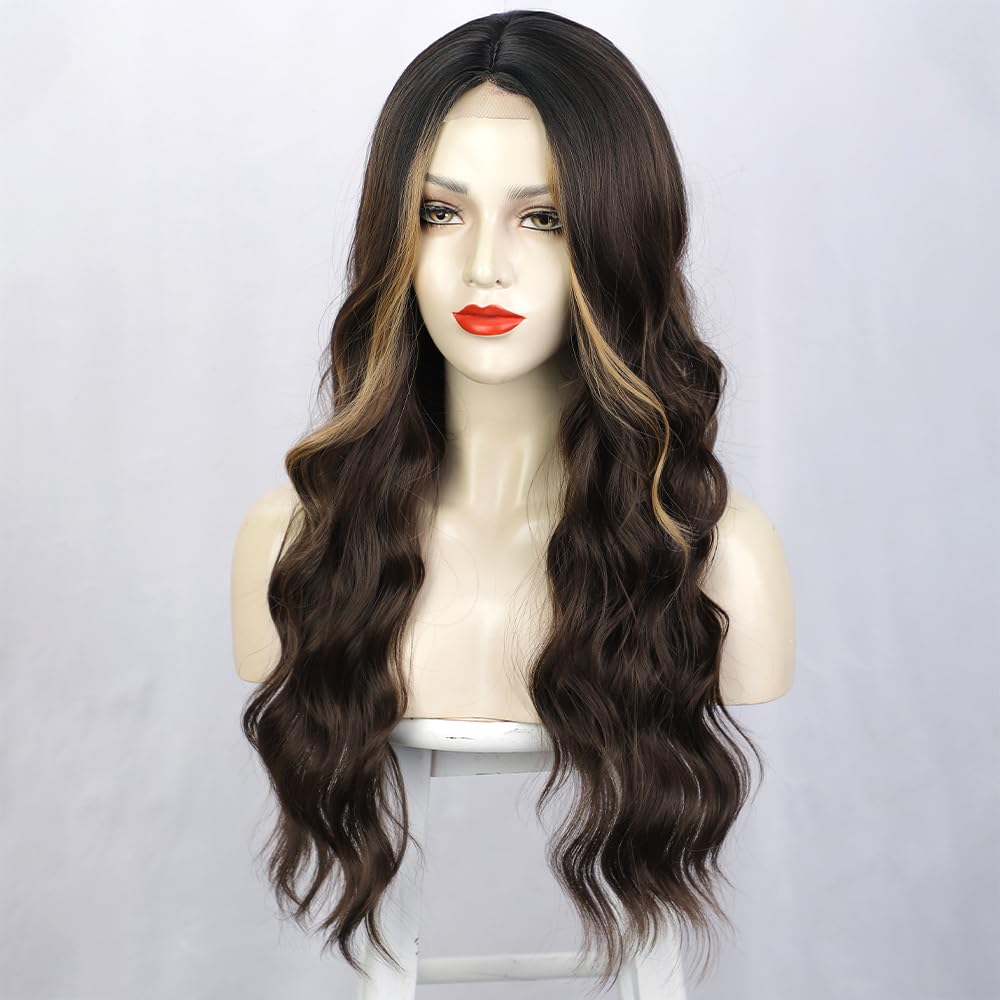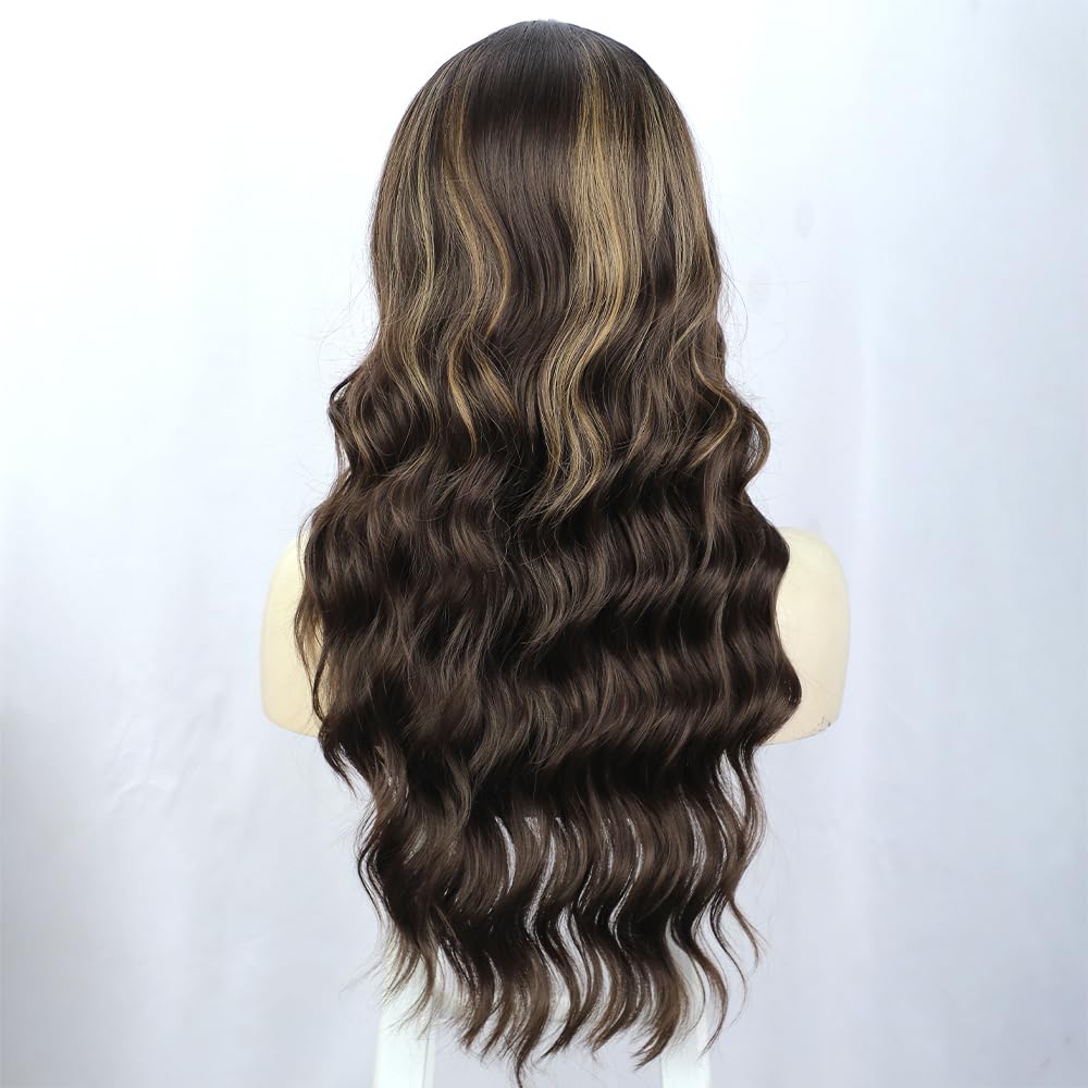 KAMA U-Part Lace Front Long Wigs For Women Middle Part Wavy Curly Wig With Dark Roots Synthetic Heat Resistant Fiber Wig For Daily Party Use (Brown Blonde Highlighted)